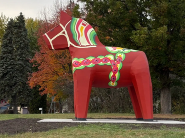 Directly across the street from the building is a statue of Karl-Oskar & Kristina Nilsson, the fictional heroes of Vilhelm Moberg’s series of novels The Emigrants, which tell the story of Swedish emigration to America. A replica of a statue in Karlshamn, Sweden, it is an attraction for tourists from Sweden and from all over the world who come to Lindström because of its Swedish heritage.
